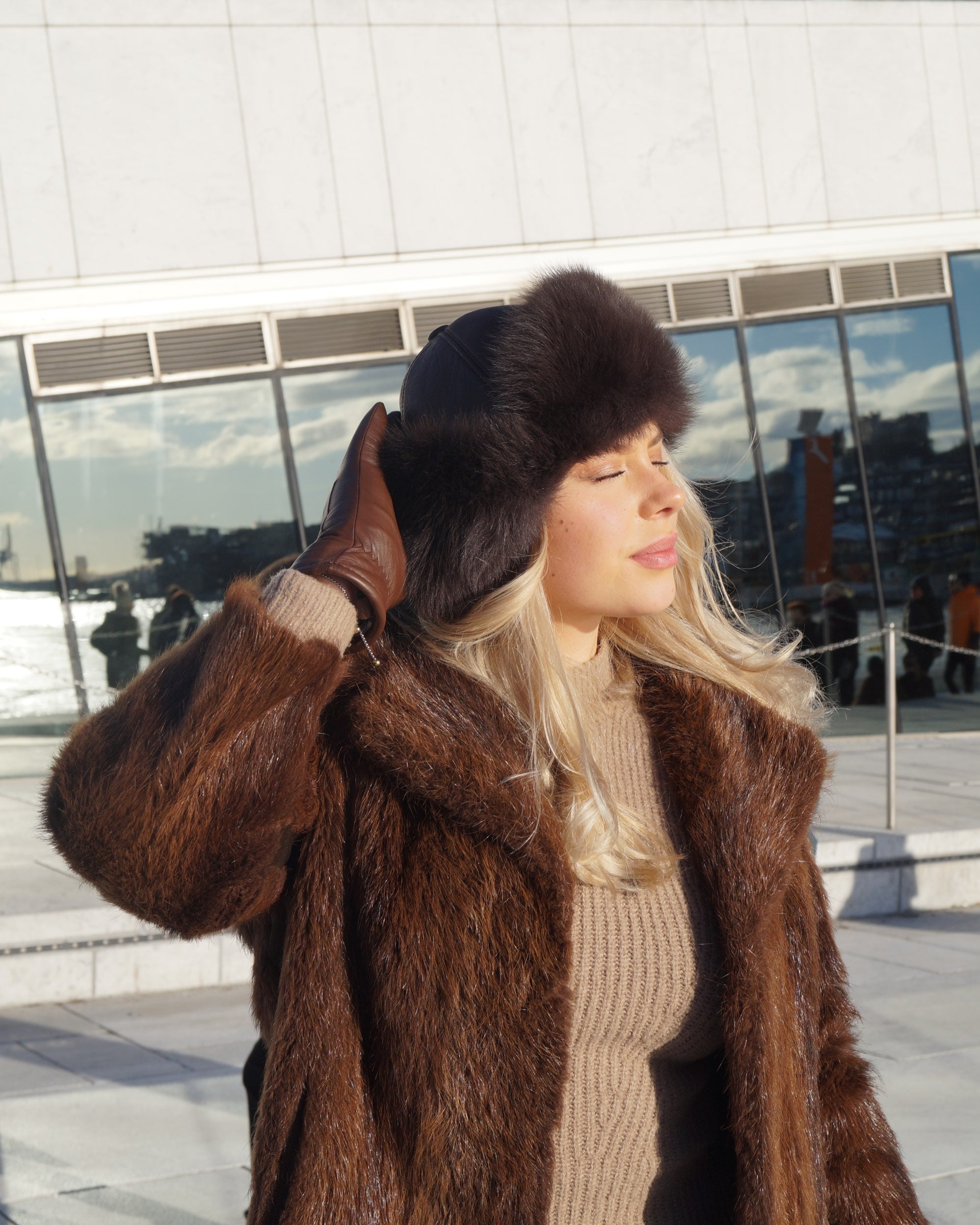 • Kant og øreklaffer: Langhåret Toscana-lammepels – ekstra varme og luksuriøs mykhet.